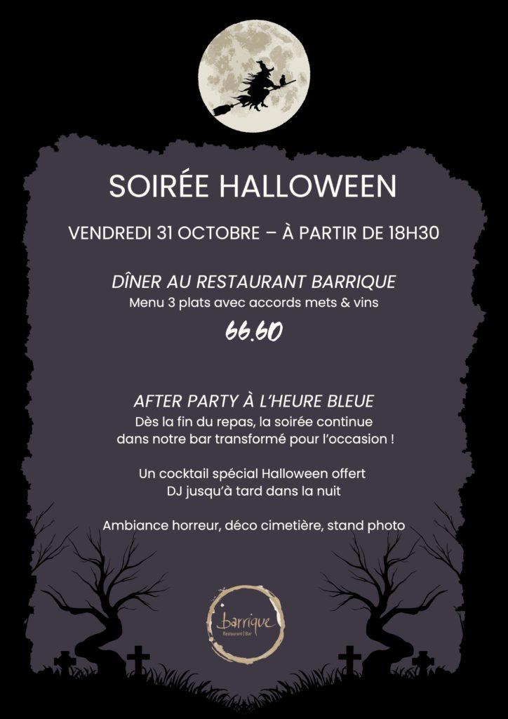 Le vendredi 31 octobre 2025, plongez dans une ambiance ensorcelante à L’Heure Bleue Bar et au Restaurant Barrique ! Profitez d’un dîner 3 plats avec accords mets & vins avant de poursuivre la soirée lors de notre After Party spéciale Halloween.