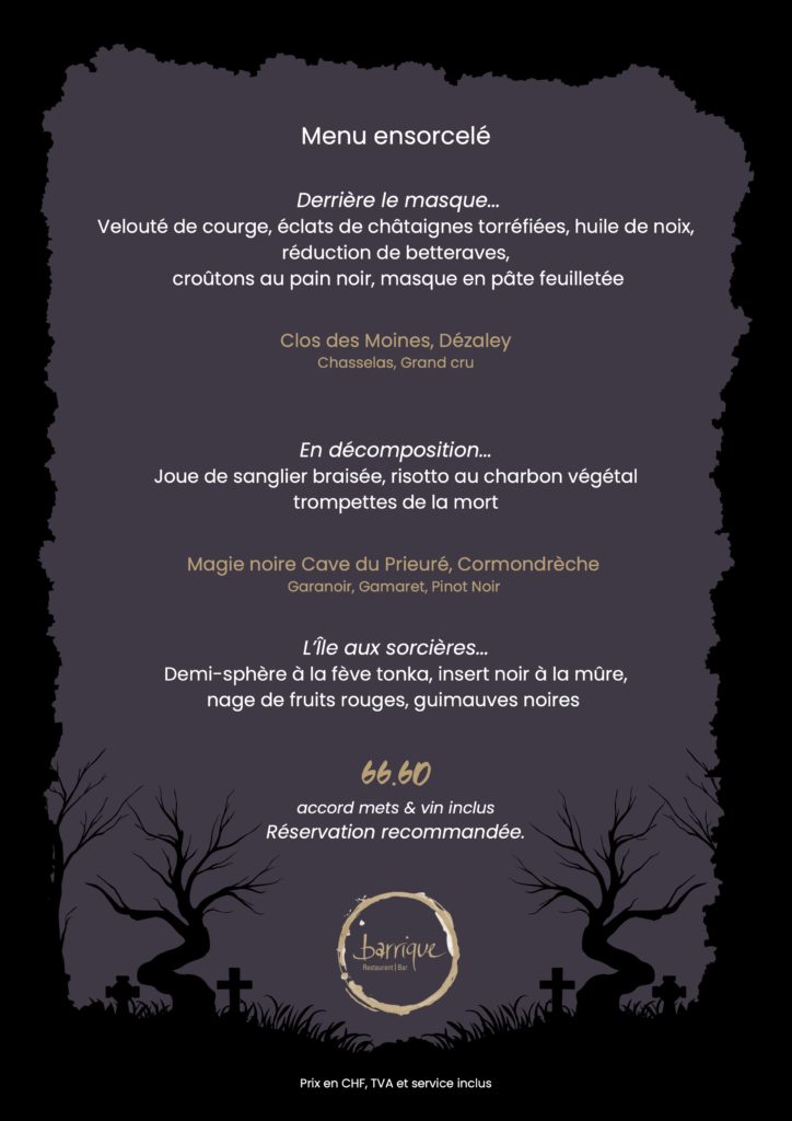 - Dîner Halloween au Restaurant Barrique – Menu 3 plats & accords mets-vins (CHF 66.60)
